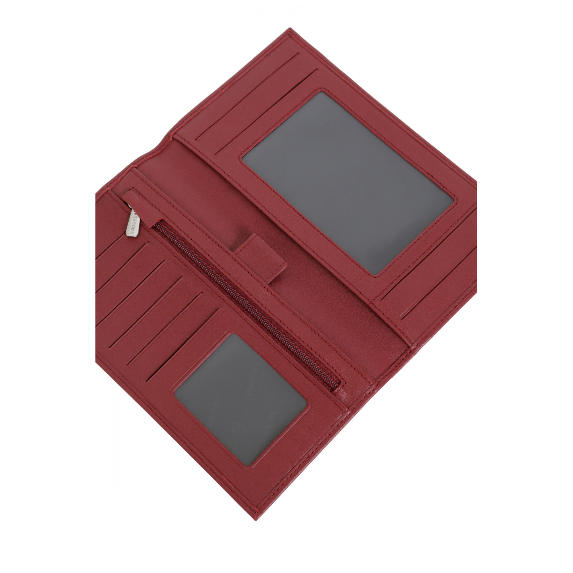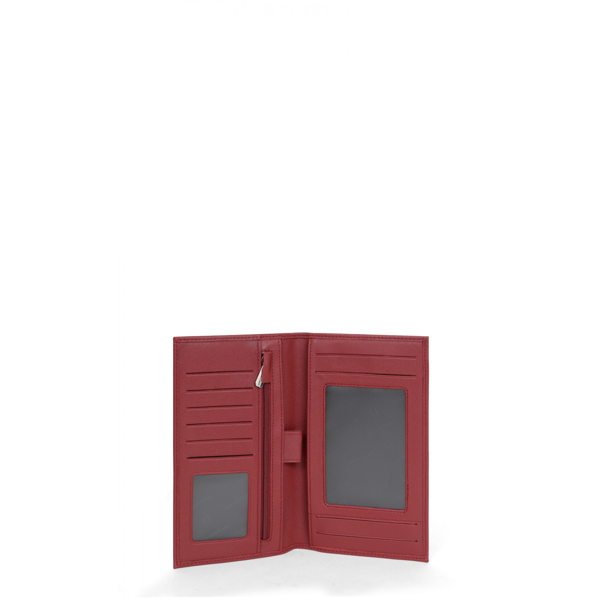 Description : un volet, deux poches plates (dont une à vue transparente), un porte-monnaie zippé, un espace chéquier, un espace stylo et six emplacements carte (dont un à vue transparente)