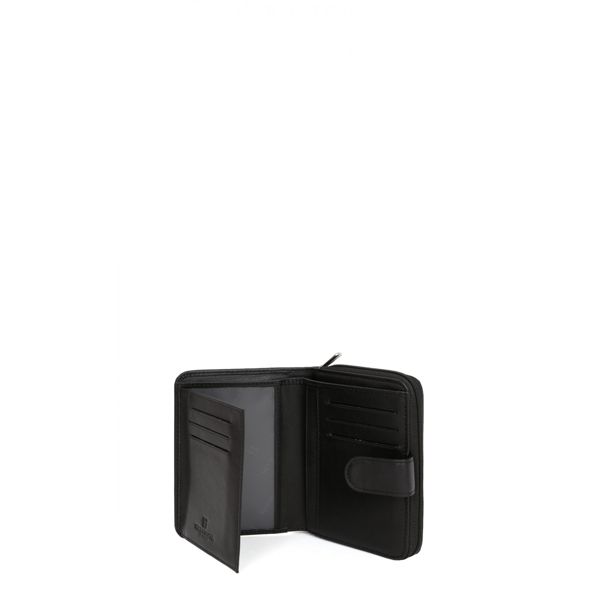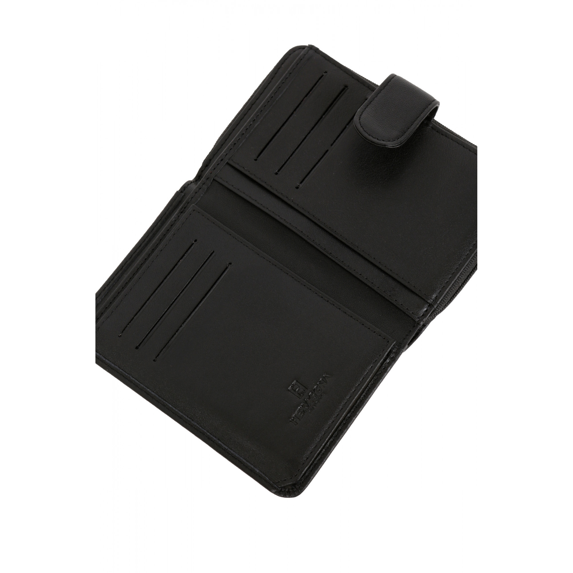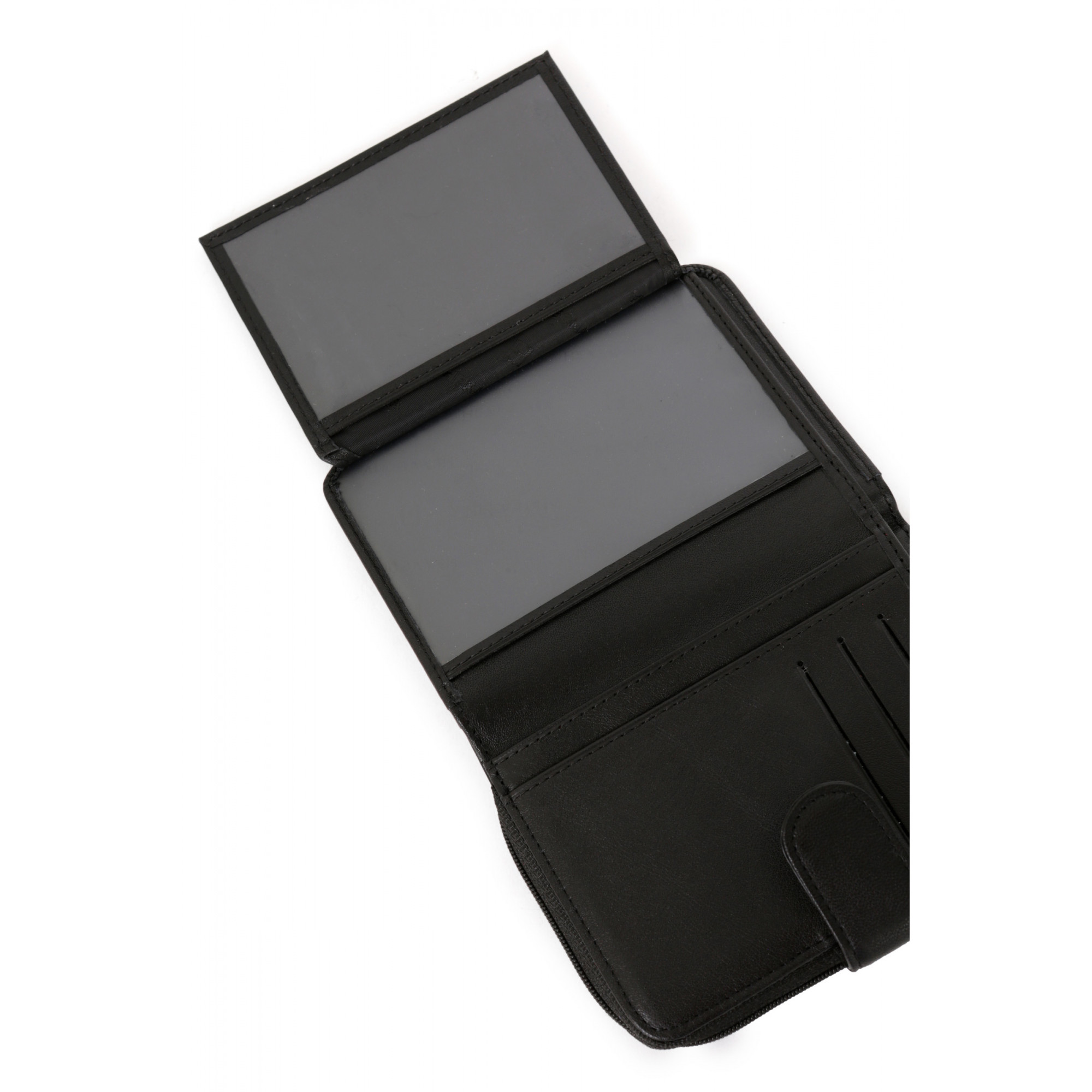 Description : deux volets, quatre poches plates (dont deux à vue transparente), un porte-monnaie zippé avec trois compartiments principaux (dont un zippé), une poche billets et six emplacements carte
