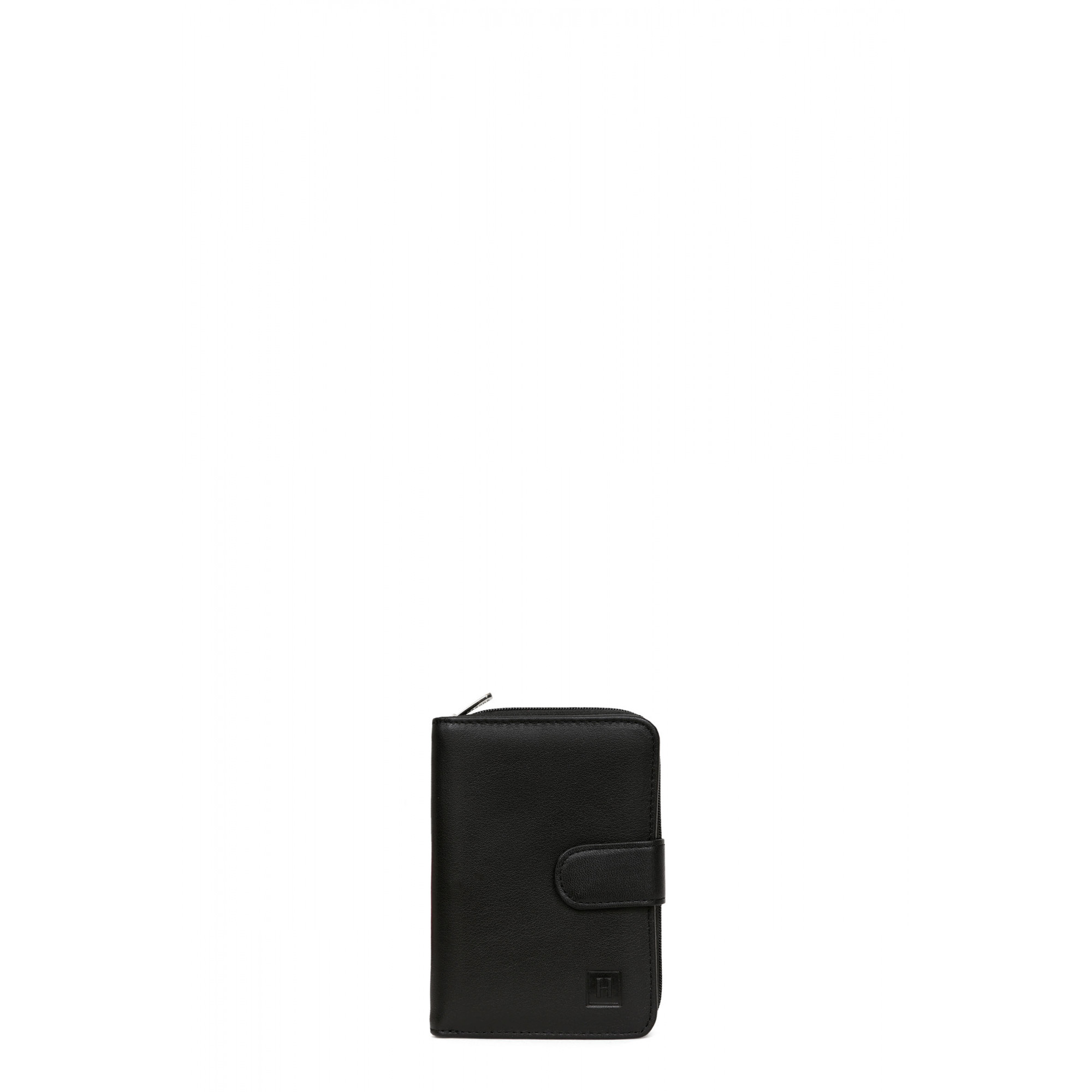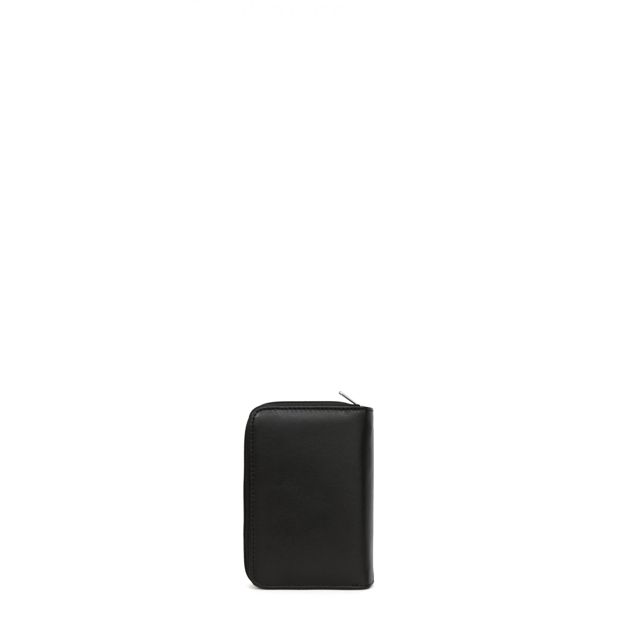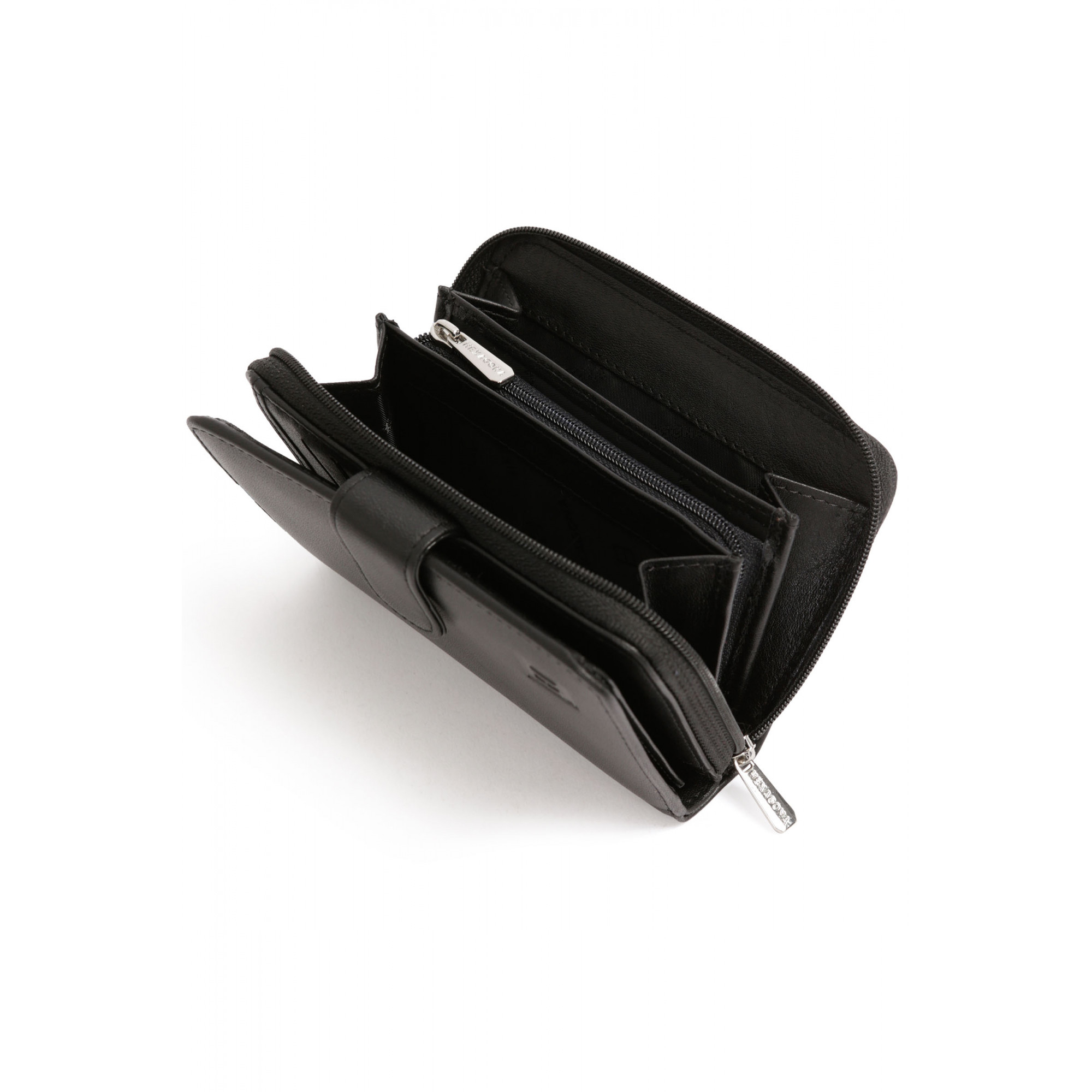 Description : deux volets, quatre poches plates (dont deux à vue transparente), un porte-monnaie zippé avec trois compartiments principaux (dont un zippé), une poche billets et six emplacements carte